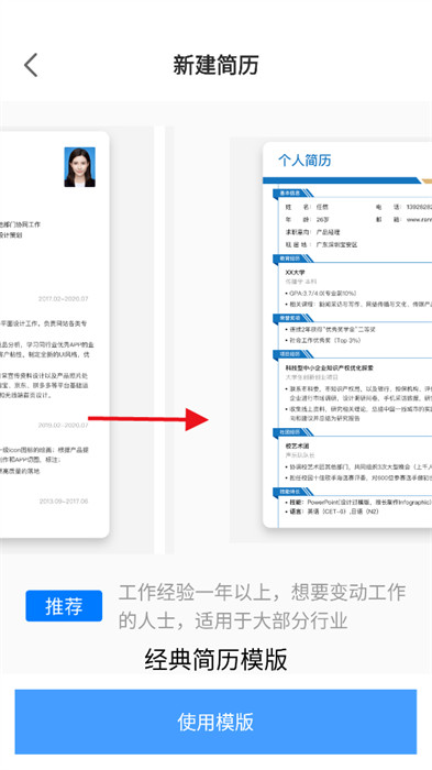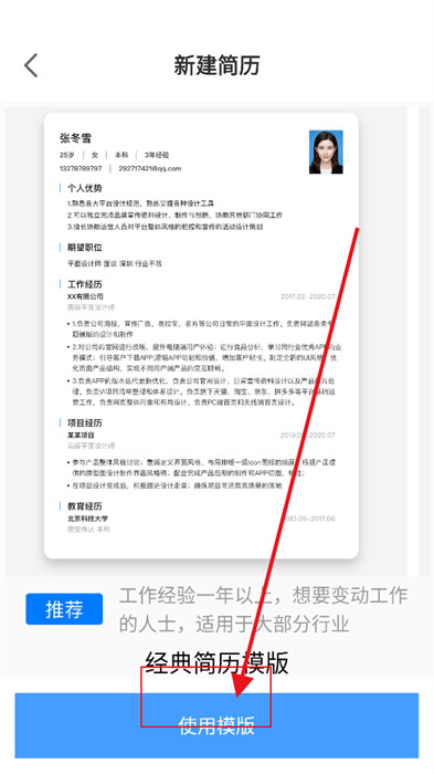 4、如果碰到了喜欢的模版,点击最下方蓝色按钮,就能在线填写自己的信息;