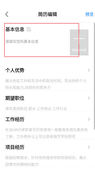 5、最后,如果所有信息已经填写完成,直接点击右上角【预览】,可以直观的看到简历效果。