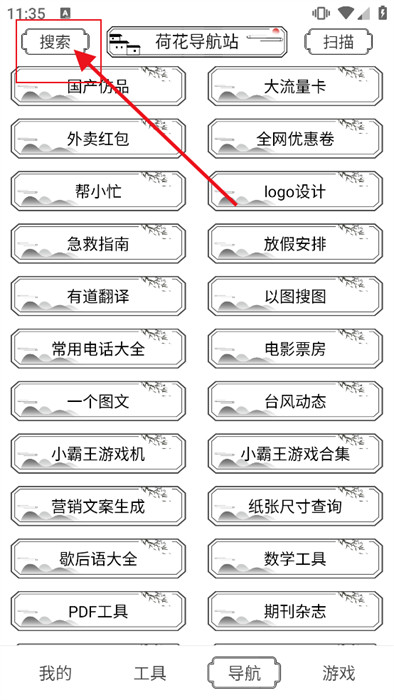 2、随后,点击右上角的搜索按钮,就会出现多个和关键词相关的功能,随意挑选一个并点击;