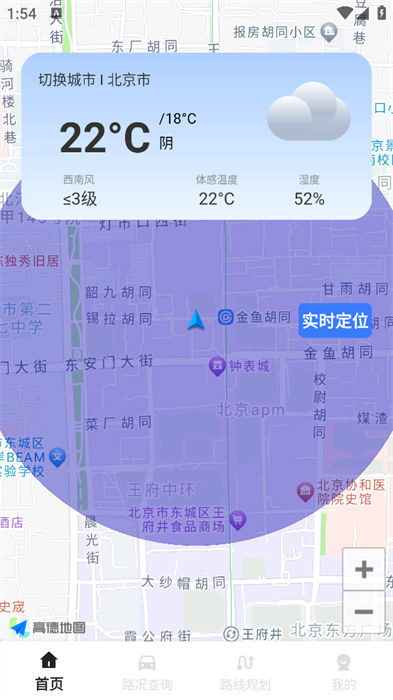 2、可以在软件的首页里面看到自己实时的位置信息和天气情况;
