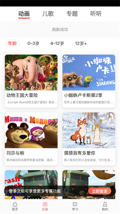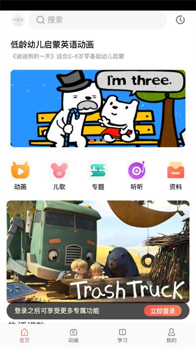 2、随后,在首页上能看到丰富的课程板块,如动画、儿歌等等,这些随意点击进入其中;