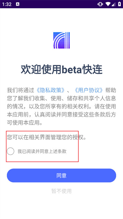 1、首先,我们将桌面上的软件点击并打开,这里的页面需要点击【同意】会再次跳转页面;