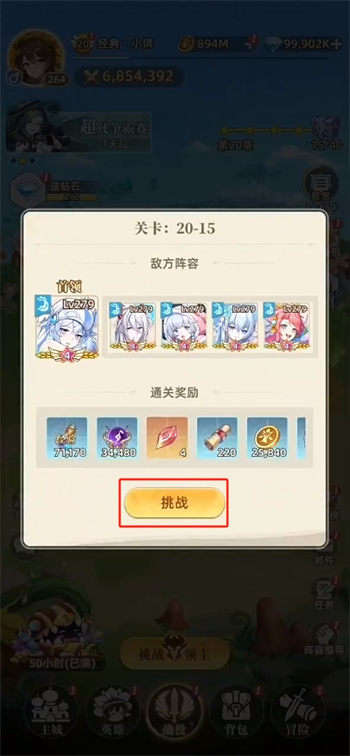 1、在这里确认敌方随机搭配的阵容挑战与战斗胜利之后所获得的奖励之后,点击下方的【挑战】按键就可以前往战场之上进行冒险;