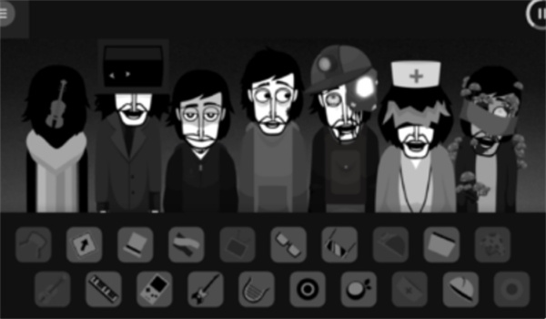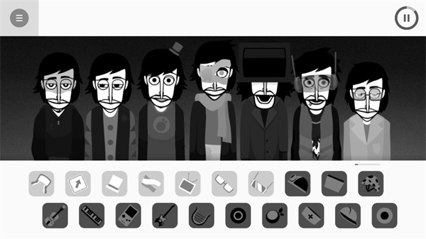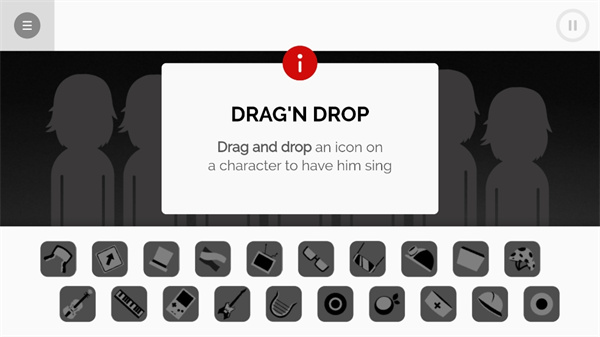 4、下方每一个方块里面都设计了不同的物品设计图标,将这些图标都放置在不同角色人物身上,上面什么都没有的角色就会出现全新的装扮并且还会发出不同的音色演奏;
