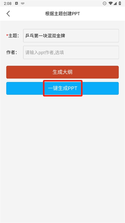 3、自己输入想要创建的PPT中心主题,然后可以输入自己的作者名称,接着选择一键生成PPT;