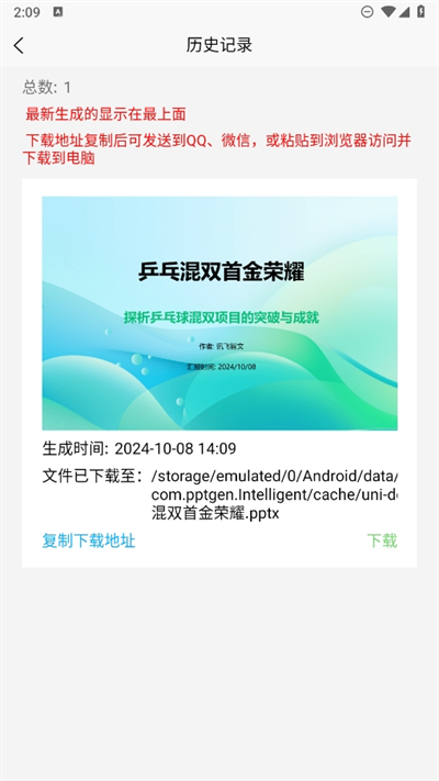 5、耐心等待一会就可以实现PPT的制作结果,并且支持一键下载方便大家进行保存和编辑等。