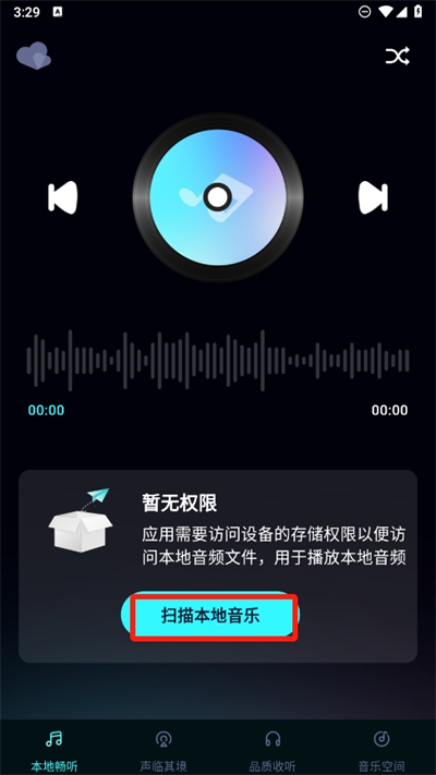 1、进入软件后可以直接在这里选择添加,点击后同意权限后直接扫描手机中的音乐并导入;