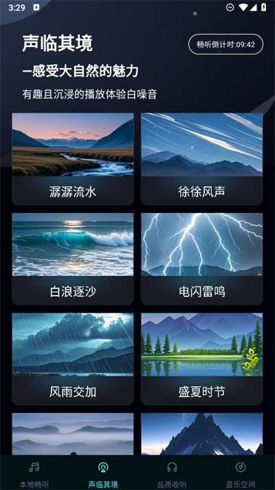 2、在这里可以看到各种白噪音的音乐效果,根据自己的喜好可以选择不同的场景享受自然音乐;