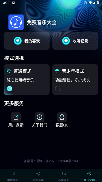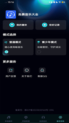 4、在音乐空间这里可以看到不同模式选择,还可以查看当前历史的收听记录找寻历史歌曲收听。