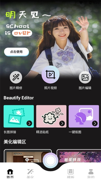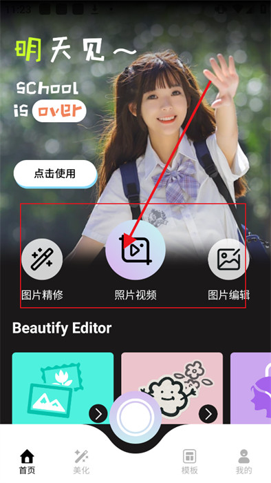 1、首先,将软件打开,并进入其中在首页可以看到一些简单的图片视频编辑板块;