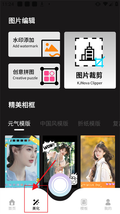 2、随后,跟随小编切换到【美化】页面,这里能对照片细节进行调整,并找到添加水印;