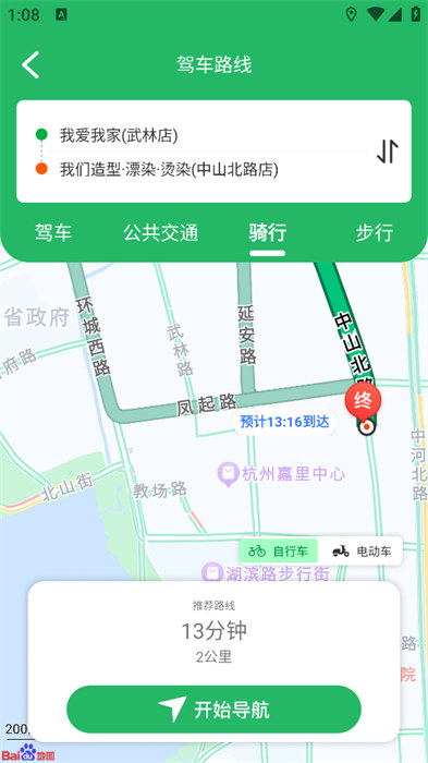 4、还可以选择骑行的方式去进行导航,选择好自行车或者是电动车就能导航了;