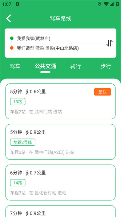 2、输入自己的起点和目的地就能看到公交前往的路线;