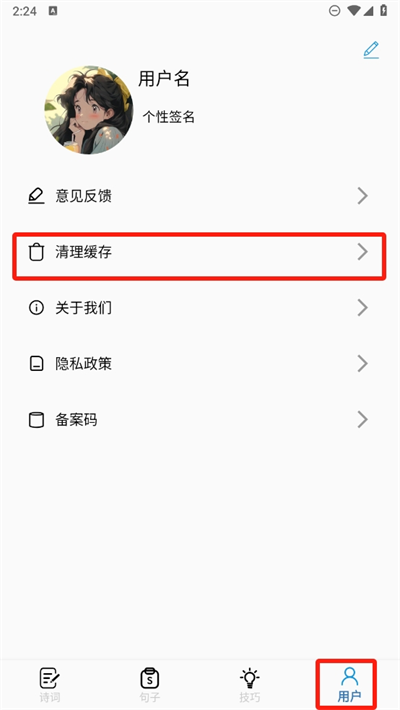 4、至于清理缓存功能我们只需要在用户这里,找寻到清理缓存点击即可清理。