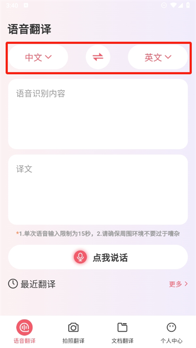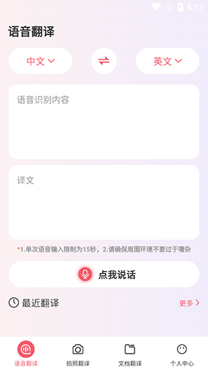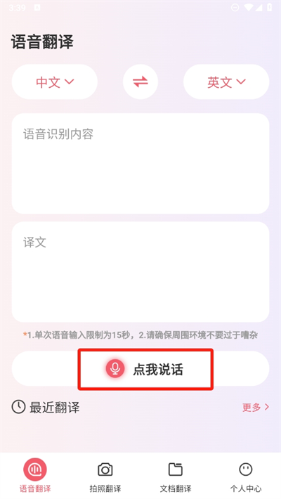2、在翻译的过程中注意单次语音输入的时间为十五秒,确保周围环境不要过于嘈杂;