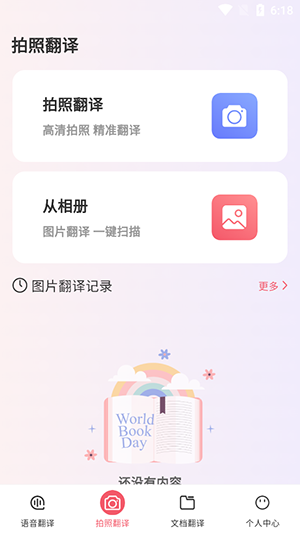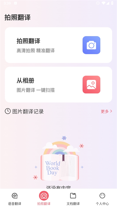 3、接着我们可以看到拍照翻译功能,支持通过拍照进行法医或者相册导入扫描翻译;
