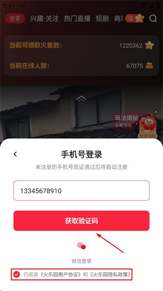 3、勾选已阅读相关协议和政策的选项,点击获取验证码按钮,等待验证码发送。