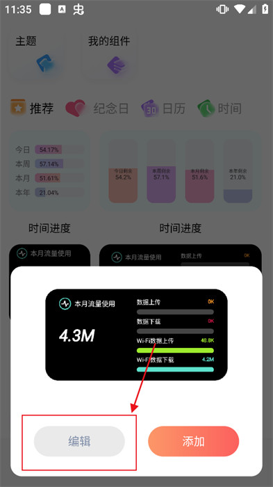 3、点击组件后,会弹出操作选项框,在选项框中,点击“添加”按钮,将该时间显示组件添加到相应位置,或进行编辑完成组件添加操作。