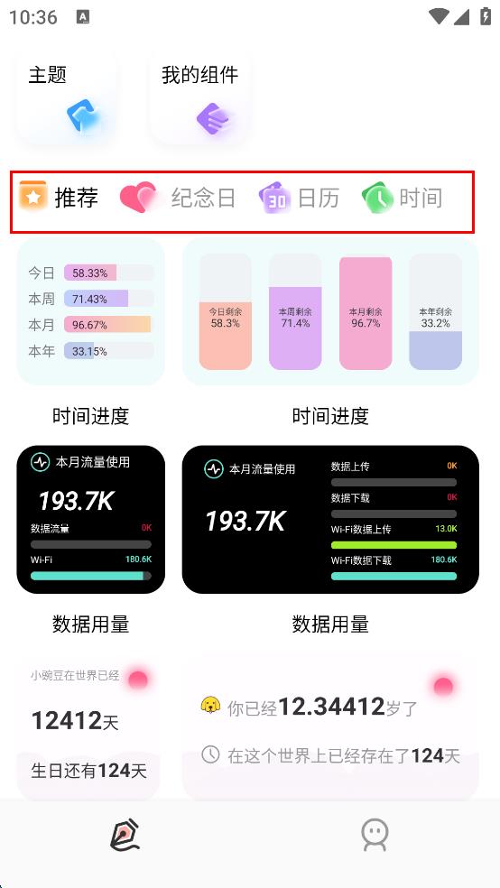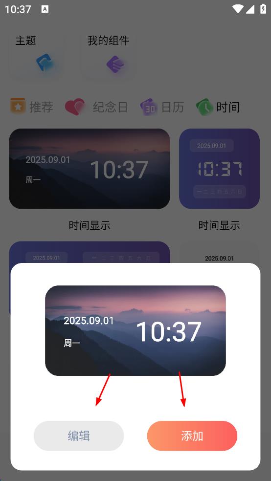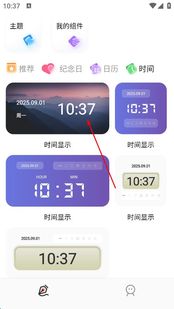1、打开主题软件,进入主界面后,在上方的分类栏中,点击“时间”选项,切换到时间相关的组件展示页面。