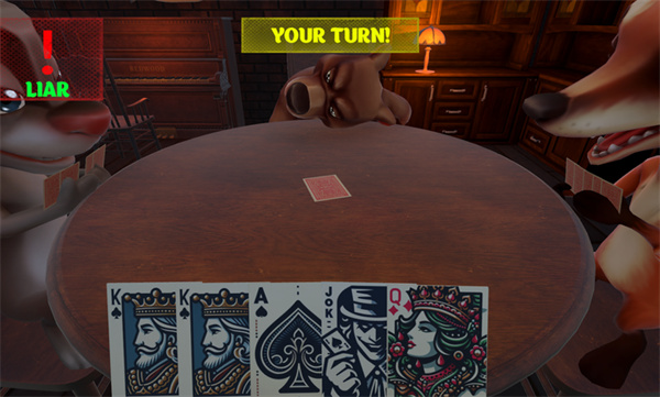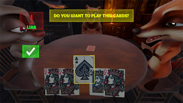 骗子酒馆仿制版为各位玩家带来和端游一样的体验,但是缺少了联机功能,只能和机器人去进行对战,但是玩法什么的都是一样的,可以带来最惊心动魄的对决,需要考验你的心理承受能力,需要在别人面前不露怯,正常的出牌,不要暴漏自己出的什么牌,这样别人就看不出来,只能凭借自己的直觉去进行考虑,要不要翻你的牌,就算翻了,我们还有机会,因为左轮中只有一颗子弹,如果不是运气太差,应该不至于第一枪就击发,所以可以放心的体验。