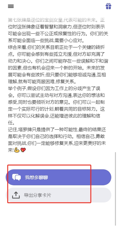 4、最终抽完七张卡牌后将会根据所有的卡牌进行解析,帮助大家了解关于自己刚刚的问题下所进行的结果回答。