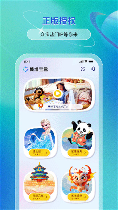 美术宝盒是一款十分好用的学习绘画的软件,这款软件里面拥有十分丰富的绘画课程内容,结合了国内和国外经典IP当中的角色以及场景,通过经典的IP角色和场景大大的提升用户们的艺术创造能力,还能够在创作的过程当中收获到勇气和成就感,全部都是一些非常实用的绘画课程内容供用户们去进行使用,选择自己想要学习的绘画课程去进行购买就可以了,操作起来非常的简单轻松,不需要任何复杂繁琐的操作就能学习绘画,欢迎有需要的用户们去进行下载体验。