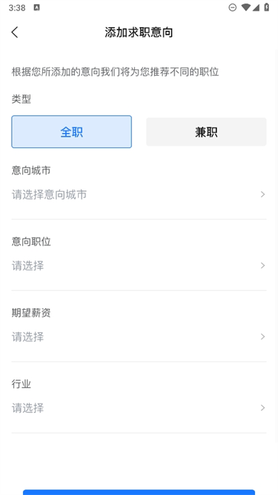 2、接着进入后需要选择自己的身份求职还是招聘,我们在这选择求职根据意向进行求职意向的填写;