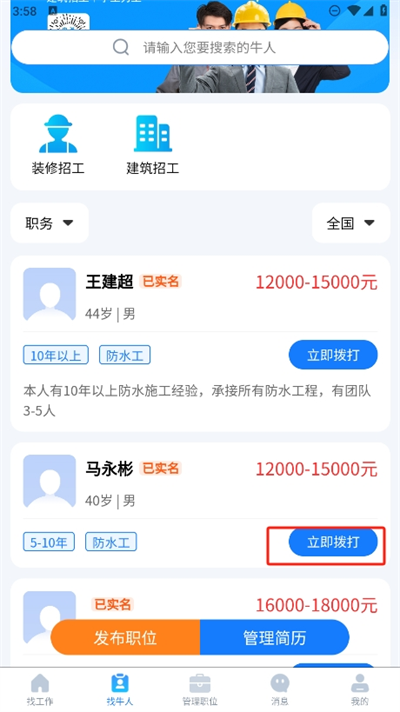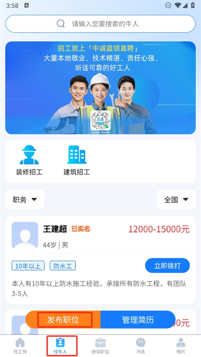 针对不同的建筑行业的工种技术上,可以根据不同的技术供进行一键招聘。