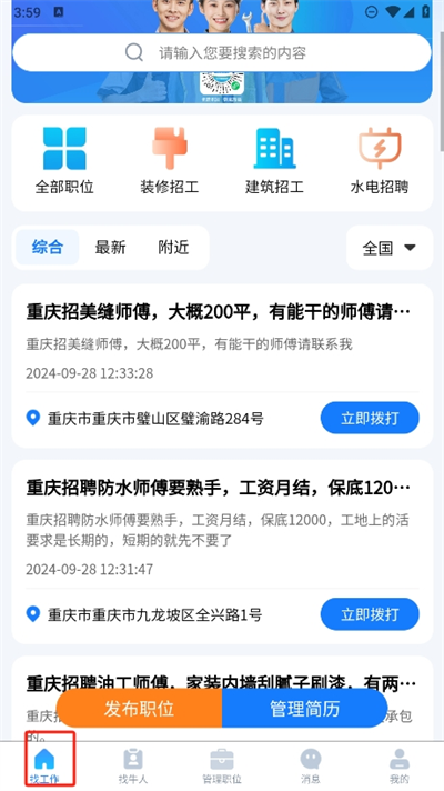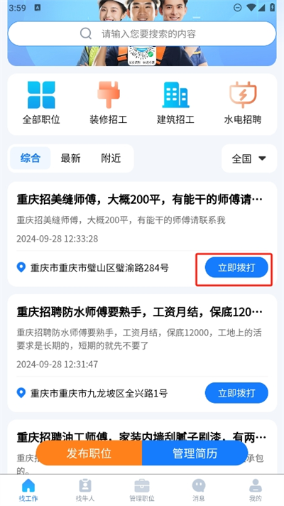 根据当前的定位进行招工,不仅可以定位当前的地理位置还能定位工种查询;