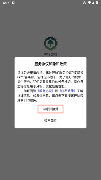 1、进入软件后先需要同意服务协议和隐私政策,同意点击下方接受才能继续使用该软件;
