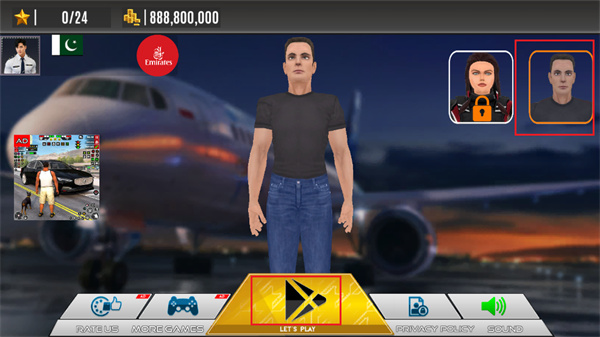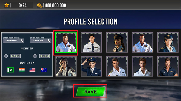 1、进入到游戏的场景内之后,玩家首先需要进行飞行员的选择,选择好之后,需要点击【save】按钮;