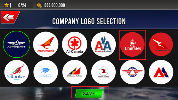 2、随后玩家将需要进行飞机公司的选择,具有多种不同的飞机公司可供玩家们选择,可以选择一个你熟悉的公司,并点击【save】按钮;