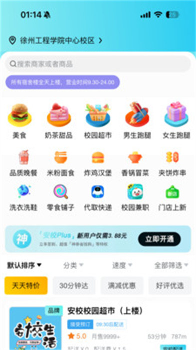 安校生活app是一款专门为了用户们点外卖打造出来的软件,这款软件里面拥有十分丰富的外卖商品,让用户们实现了在任何地方都能进行点外卖的操作,全部都是有一些非常实用的功能内容供用户们去进行使用,使用自己所需要使用的功能内容就可以了,可以选择外卖和跑腿去进行操作,操作起来非常的简单轻松,不需要任何复杂繁琐的操作就能完成外卖点单的操作,外卖点单变得更加的简单,欢迎有需要点外卖的用户们去进行下载体验的操作。