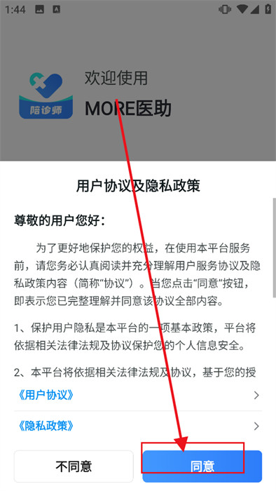 1、第一次下载软件,需要在这里打开,并进入到其中,点击【同意】,如下图;