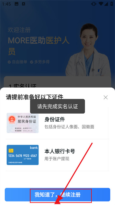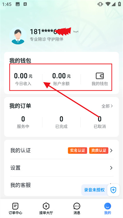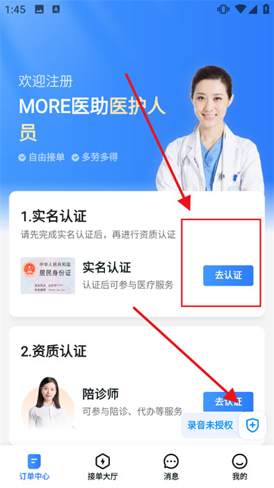 3、接着,大家想要接单都需要进行实名认证和陪诊资格的认证,在首页上就能操作;