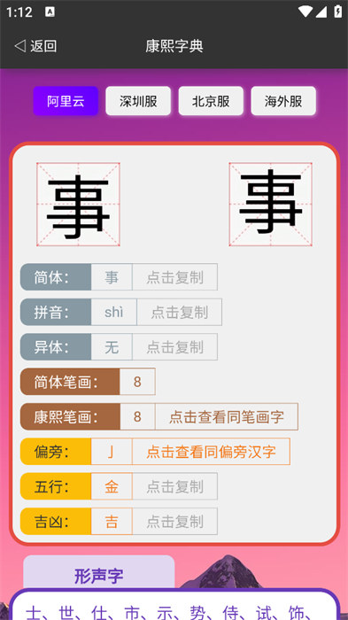 3、点击自己想要了解的文字之后就会为用户们呈现出拼音和形声字等相关的内容;