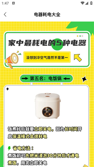 1、进入到软件之后可以查看到电器耗电大全,更加清楚的了解到哪些更耗电些;