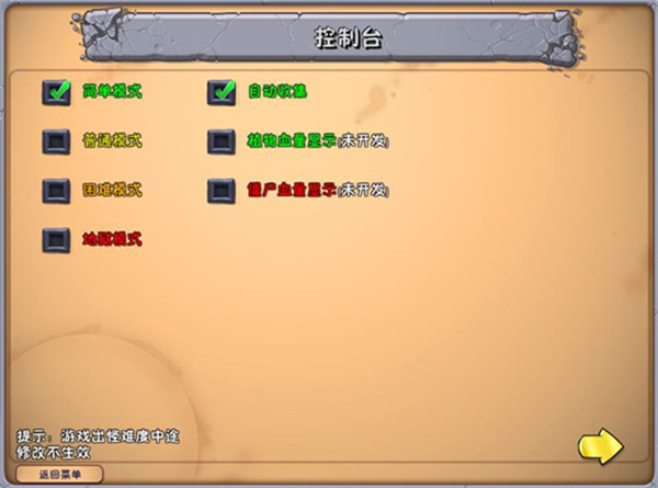 2、可以在控制台之中进行各种难度的选择,以选择一个适合自己的游戏难度,还可以开启自动收集阳光的功能;