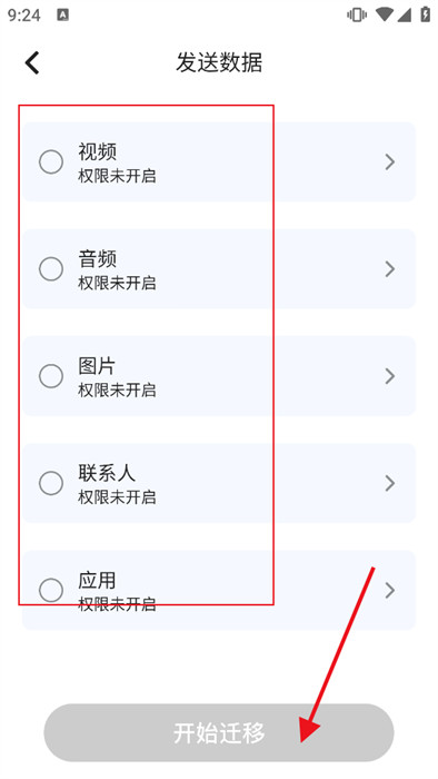 2、接着,点击【右上角按钮】可自动跳转页面,直接选择当前设备的数据,并点击下方【开始迁移】;