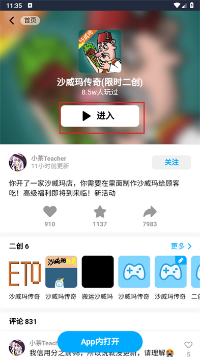 3、此时只需要点击屏幕上方的【进入】按钮,玩家即可以快速的开启创游版沙威玛游戏的玩耍;