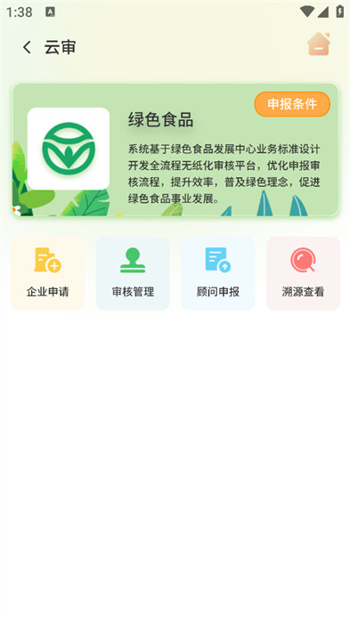 1、进入到软件之后可以进行企业申请和查看申报条件等;