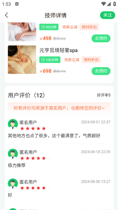 2、点击自己想要查看的技师能够看到及时的详细信息和真实的用户评价;