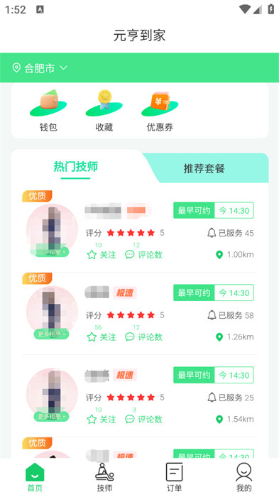 1、进入到软件的首页之后可以看到热门的技师,还能够看到技师的评分和距离自己多远等;
