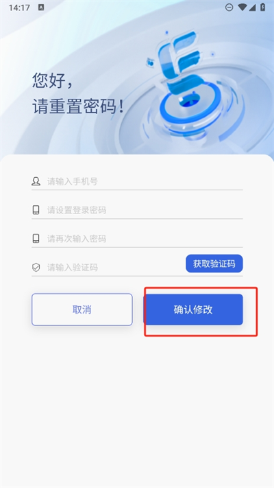 2、接着我们输入注册的手机号后,重新设置登录密码并获取验证码输入验证码后点击确认修改即可;