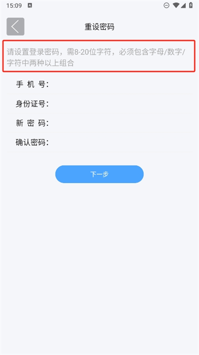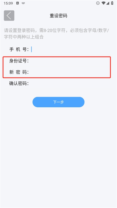 4、接着就要输入真实的身份证号,然后输入自己设置的新密码就后点击下一步即可直接重置密码了。