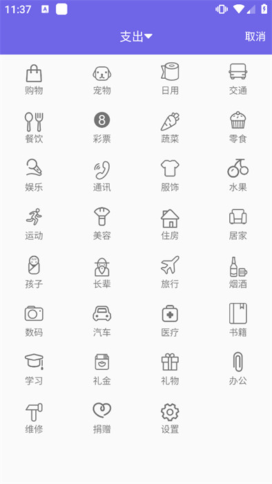 2、随后,这里都将具体的板块进行分类,如出行、美食、社交等等,挑选记账的板块进入;