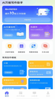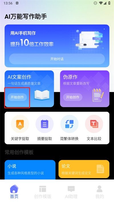 1、新人需要先注册登录进入软件,接着可以看到首页处的ai文案创作栏目选择开始创作;