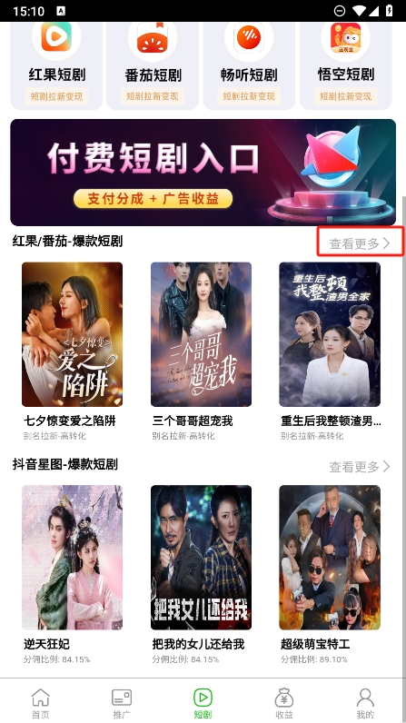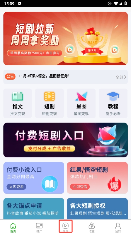 1、在这里可以看到支持多个平台的视频变现功能,如今可以查看下方的短剧栏目进行查看;