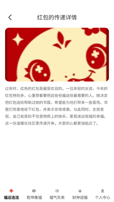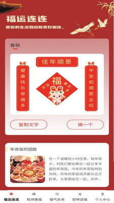 福满乾坤app是一款能给大家带来更多福气的软件,其中能准备很多春联、集福活动,随时都能在线查看了解关于福气的词汇和成语,让用户的生活都能福气满满,以便大家掌握更多关于福气方面的词汇,在重要节日和亲戚交流的时候也能脱口而出,同时软件内还能了解到各种关于春节的一些常识,如鞭炮的起源、春联的历史等等,都能让现在的年轻人对春节了解的更多,真实的感受传统节日的乐趣,并增添更多不一样的节日玩法。