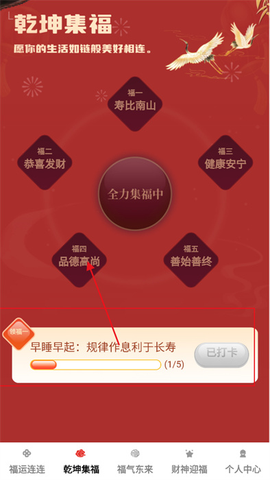 3、随后,切换页面,你能每天完成这里的健康训练打卡,可获得福字,通过集福来监督自己运动;